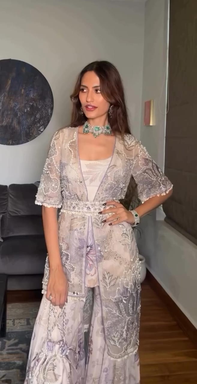 Turn heads at any celebration with this stunning Jacket Style Sharara Set, a perfect blend of traditional charm and modern elegance. Made with premium georgette fabric and detailed floral digital prints, this fully stitched ensemble is enhanced with an intricately crafted pearl work jacket and a heavy hand-embroidered belt — making it the ultimate choice for weddings, parties, or festive occasions.