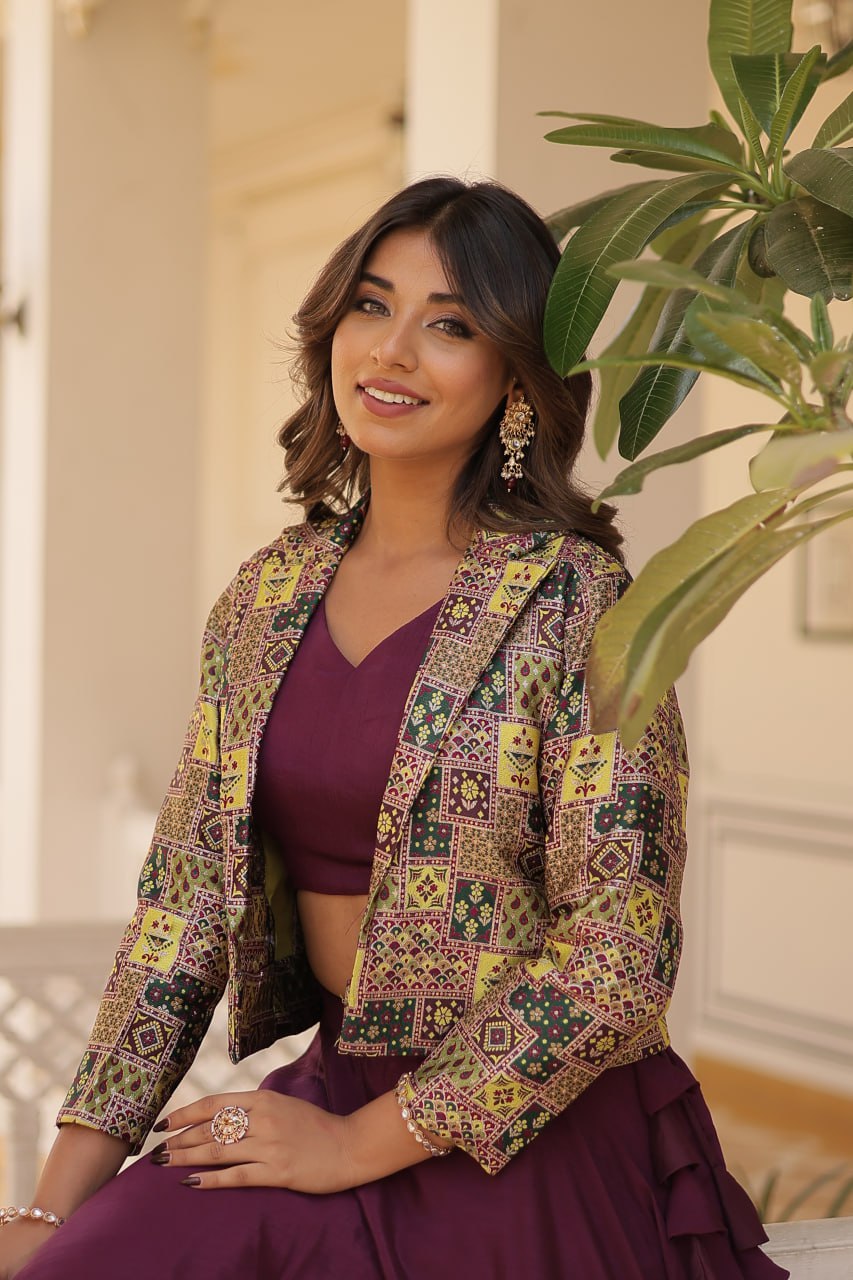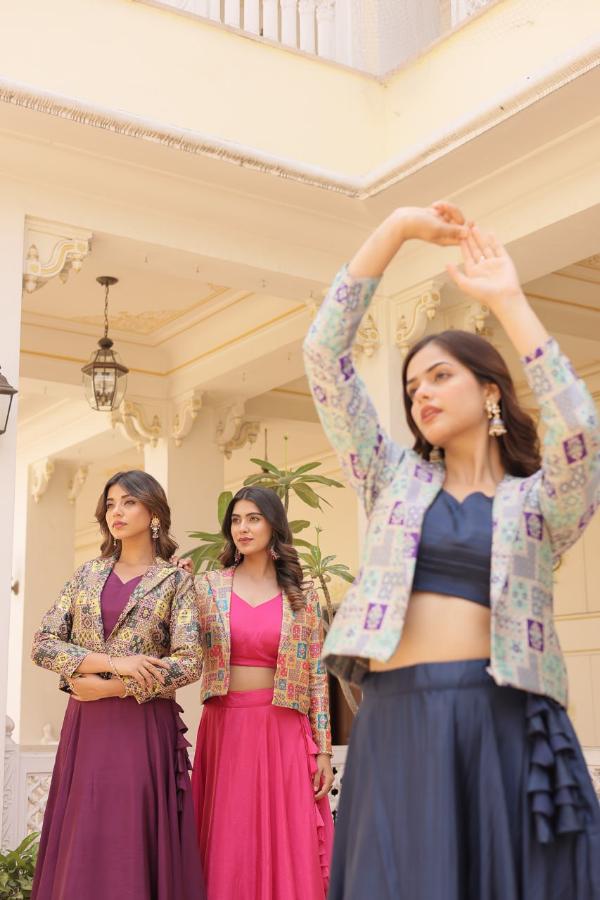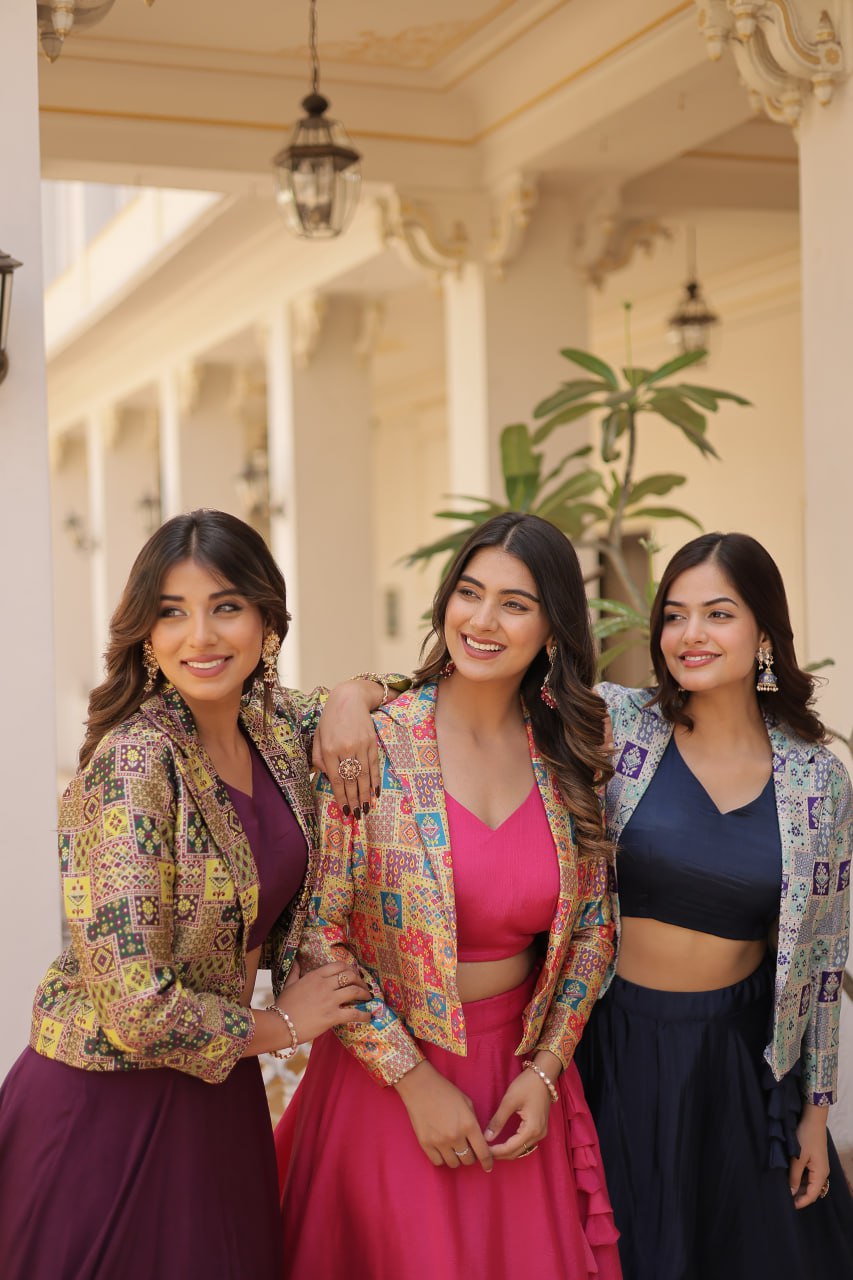 Stylish Chinon Fully Stitched Designer Lehenga Choli Koti Set - Ethnicwish Stylish Chinon Fully Stitched Designer Lehenga Choli Koti Set - Ethnicwish